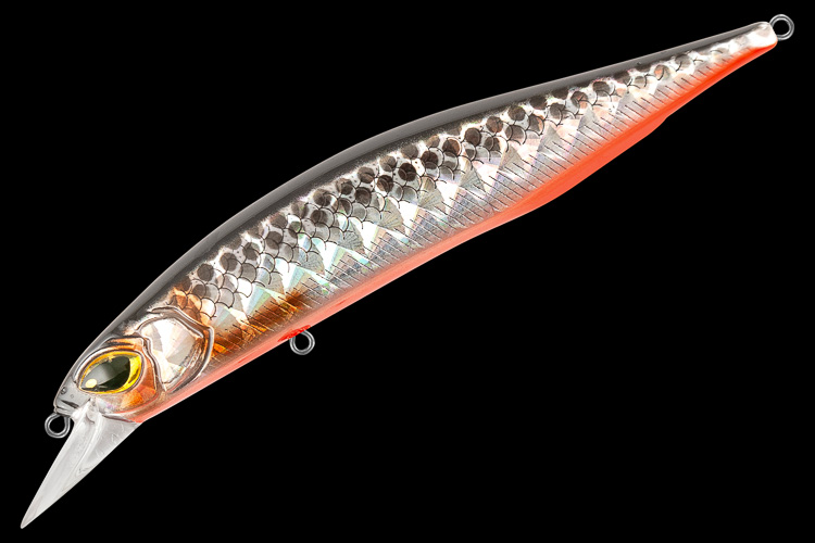 Особенности дизайна: В оформлении поверхности воблера использованы два варианта фактуры: спина гладкая, верхняя часть боков выполнена насечками в виде чешуек, а ниже боковой линии – в виде косых насечек. Головная часть – имитация головы настоящей рыбки, с жаберными крышками и очень крупными вытянутыми 3D глазами. Общий стиль приманки весьма реалистичный. Воблер вооружен двумя тройниками OWNER и силовыми заводными кольцами. Имеется система баланса и магнитная система дальнего заброса. ЛКП соответствует лучшим образцам современного воблеростроения.