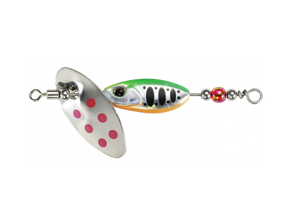 Oryginalna łyżka obrotowa In-line z obszernym, realistycznym rdzeniem o wadze 5,0 g. Płatek jest klasycznym In-line: mocowany bez zacisku. Ma dość mocną grę, błystka jest widoczna dla ryb z dużej odległości. Oś jest wykonana ze stali nierdzewnej, ze zintegrowanym krętlikiem i szkarłatnym koralikiem w pobliżu trójnika, który służy jako punkt celowania.