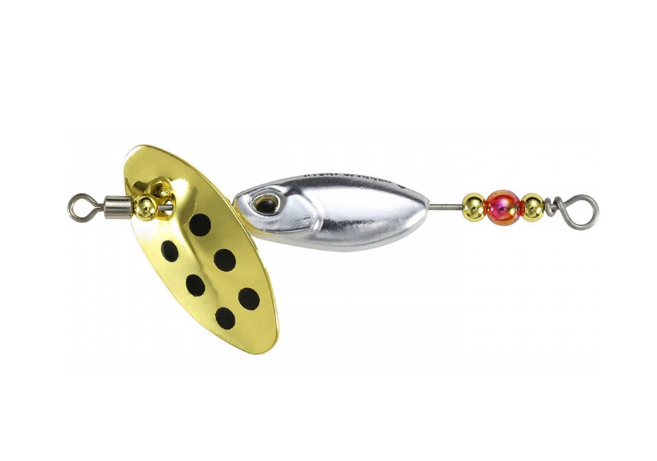 Oryginalna łyżka obrotowa In-line z obszernym, realistycznym rdzeniem o wadze 5,0 g. Płatek jest klasycznym In-line: mocowany bez zacisku. Ma dość mocną grę, błystka jest widoczna dla ryb z dużej odległości. Oś jest wykonana ze stali nierdzewnej, ze zintegrowanym krętlikiem i szkarłatnym koralikiem w pobliżu trójnika, który służy jako punkt celowania.