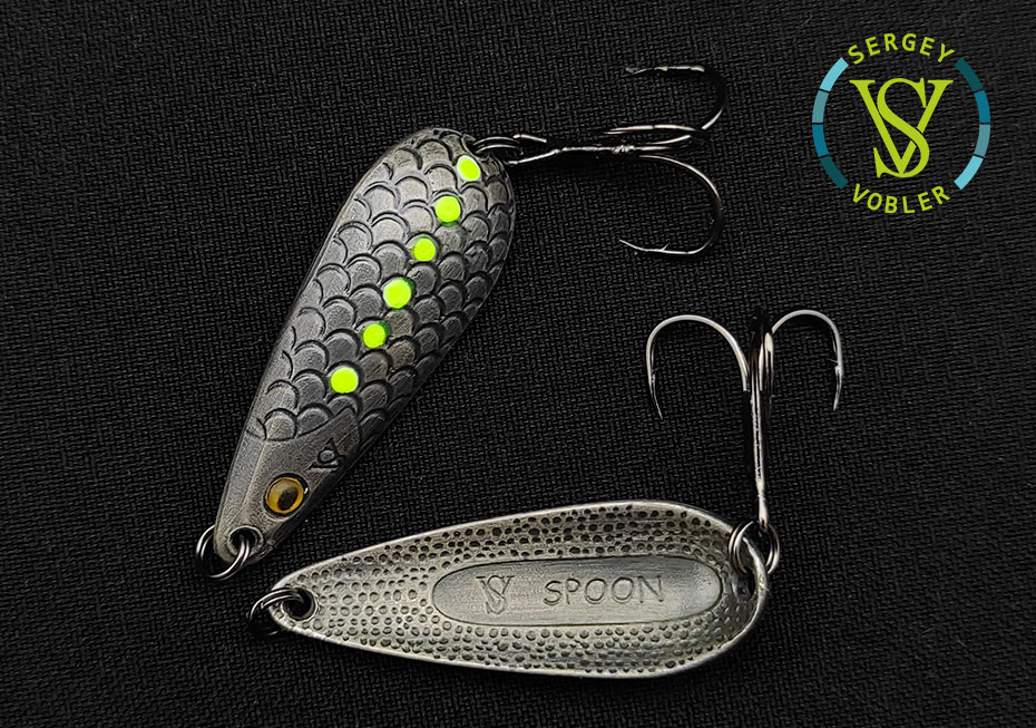 Тело блесны отлито из авторского сплава на основе чистого олова с покрытием.