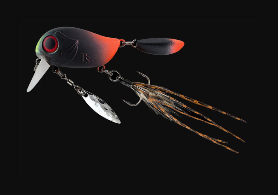 Особенности дизайна: KIKI 54F не похож на остальные воблеры-кренки, поскольку имеет в своей конструкции ряд оригинальных дополнительных элементов, призванных привлечь внимание хищной рыбы. Под брюшком у приманки находится подвижный металлический лепесток, который вращается при проводке, в задней части – жесткий пластиковый хвостик, который при движении в воде колеблется из стороны в сторону, а единственный тройник воблера оснащён мушкой из перьев и довольно длинных силиконовых нитей. Головная часть KIKI 54F рельефно имитирует жаберные крышки, а вклеенные объемные 3D глаза завершают реалистичный дизайн приманки.