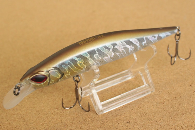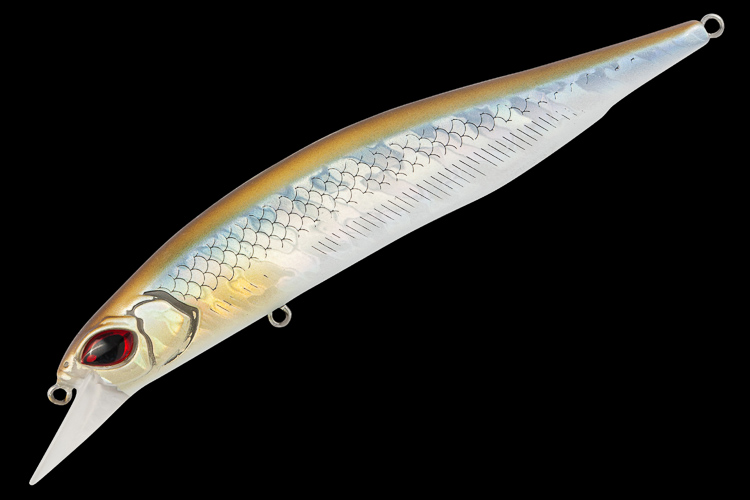 Особенности дизайна: В оформлении поверхности воблера использованы два варианта фактуры: спина гладкая, верхняя часть боков выполнена насечками в виде чешуек, а ниже боковой линии – в виде косых насечек. Головная часть – имитация головы настоящей рыбки, с жаберными крышками и очень крупными вытянутыми 3D глазами. Общий стиль приманки весьма реалистичный. Воблер вооружен двумя тройниками OWNER и силовыми заводными кольцами. Имеется система баланса и магнитная система дальнего заброса. ЛКП соответствует лучшим образцам современного воблеростроения.